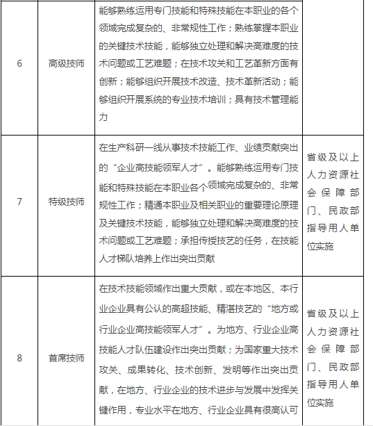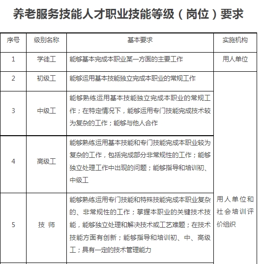 (一)全面推行职业技能等级制度。以养老护理员为重点,对从事养老服务技能类职业(工种)的技能人才实行职业技能等级制度。对养老护理员等设有高级技师等级的养老服务技能类职业(工种),可在高级技师之上增设特级技师和首席技师技术职务(岗位),在初级工之下补设学徒工,形成“八级工”职业技能等级(岗位)序列(见附件)。鼓励具备条件的养老服务企业在人力资源社会保障部门、民政部门指导下,制定特级技师和首席技师技术职务(岗位)评价规范并开展评聘工作。