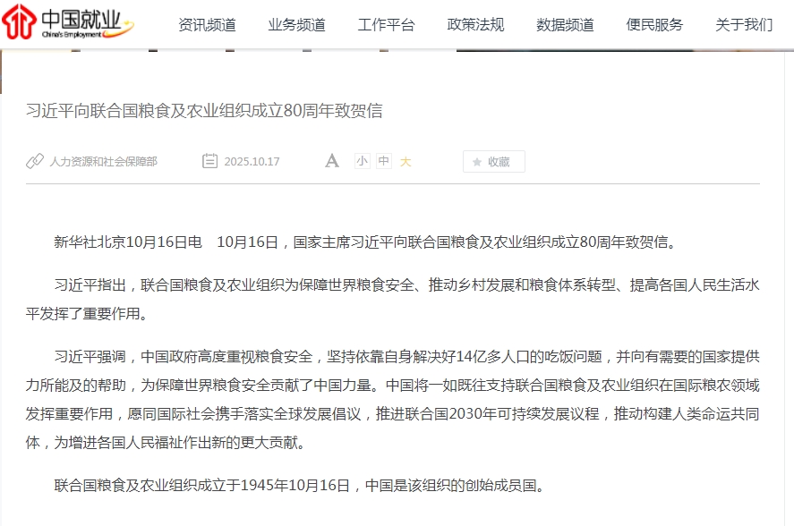 2025年10月16日,国家主席习近平向联合国粮食及农业组织(FAO)成立80周年致贺信。这一举动,不仅是对该组织数十年来在保障全球粮食安全、推动农业发展中重要作用的高度认可,更是中国作为负责任大国,再次向世界宣示其对农业发展这一“国之大者”与“天下大计”的坚定承诺。